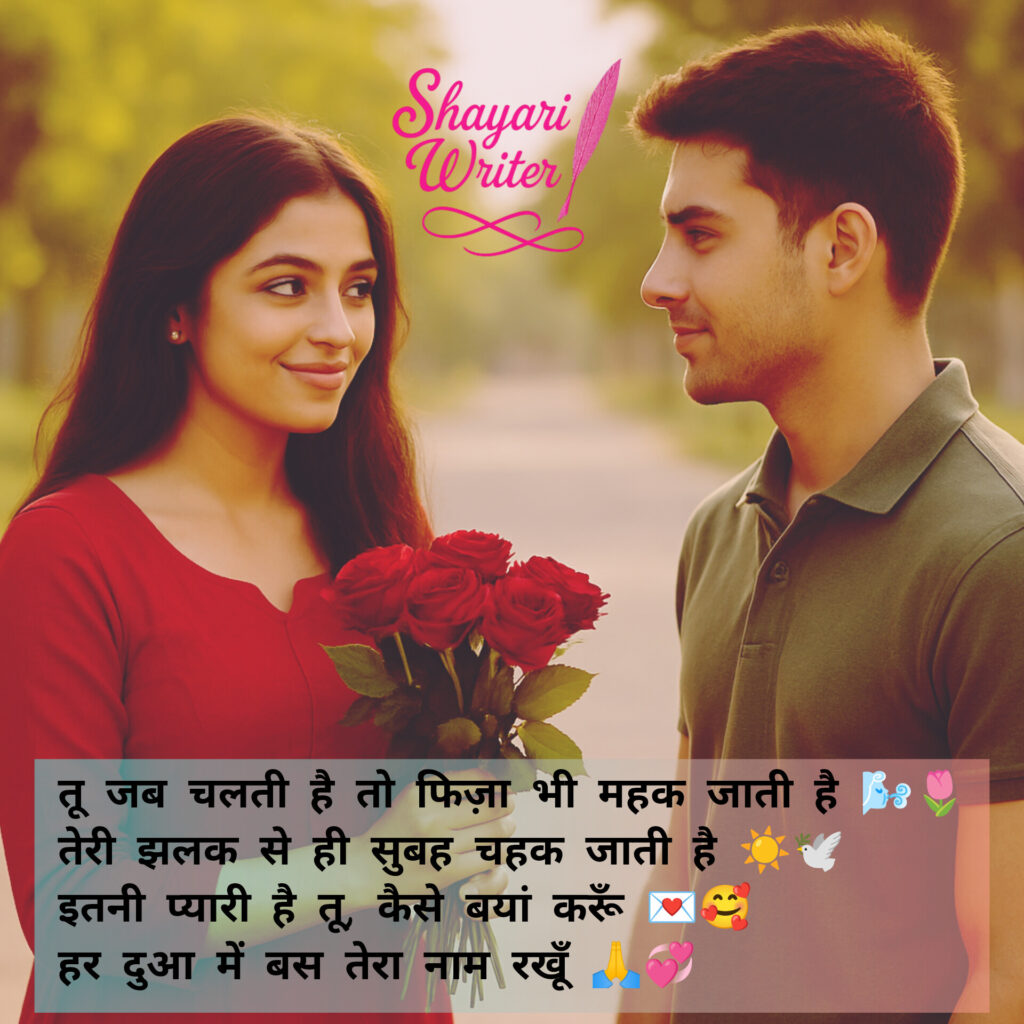 Tareef Shayari तू जब चलती है तो फिज़ा भी महक जाती है 🌬️🌷तेरी झलक से ही सुबह चहक जाती है ☀️🕊️ admin June 26, 2025 Author admin Continue Reading Previous Previous post: तेरी आँखों में डूब जाने को जी चाहता है 👁️💘हर लम्हा बस तुझे ही देखने को जी चाहता है 🕰️💑Next Next post: तेरे चेहरे की रौशनी चाँद को भी शर्मिंदा कर दे 🌝✨ Leave a Reply Cancel replyYour email address will not be published. Required fields are marked *Comment * Name * Email * Website Save my name, email, and website in this browser for the next time I comment. Related News 🌟 वो लड़की खामोश रहकर भी बहुत कुछ कहती है,उसकी आंखें उसके दिल का हाल बयां कर देती हैं। 🥺💕 July 9, 2025 💃 वो चलती है तो जैसे हवा महक जाती है,उसकी सादगी सब पे रहम कर जाती है। 🌸🍃 July 9, 2025