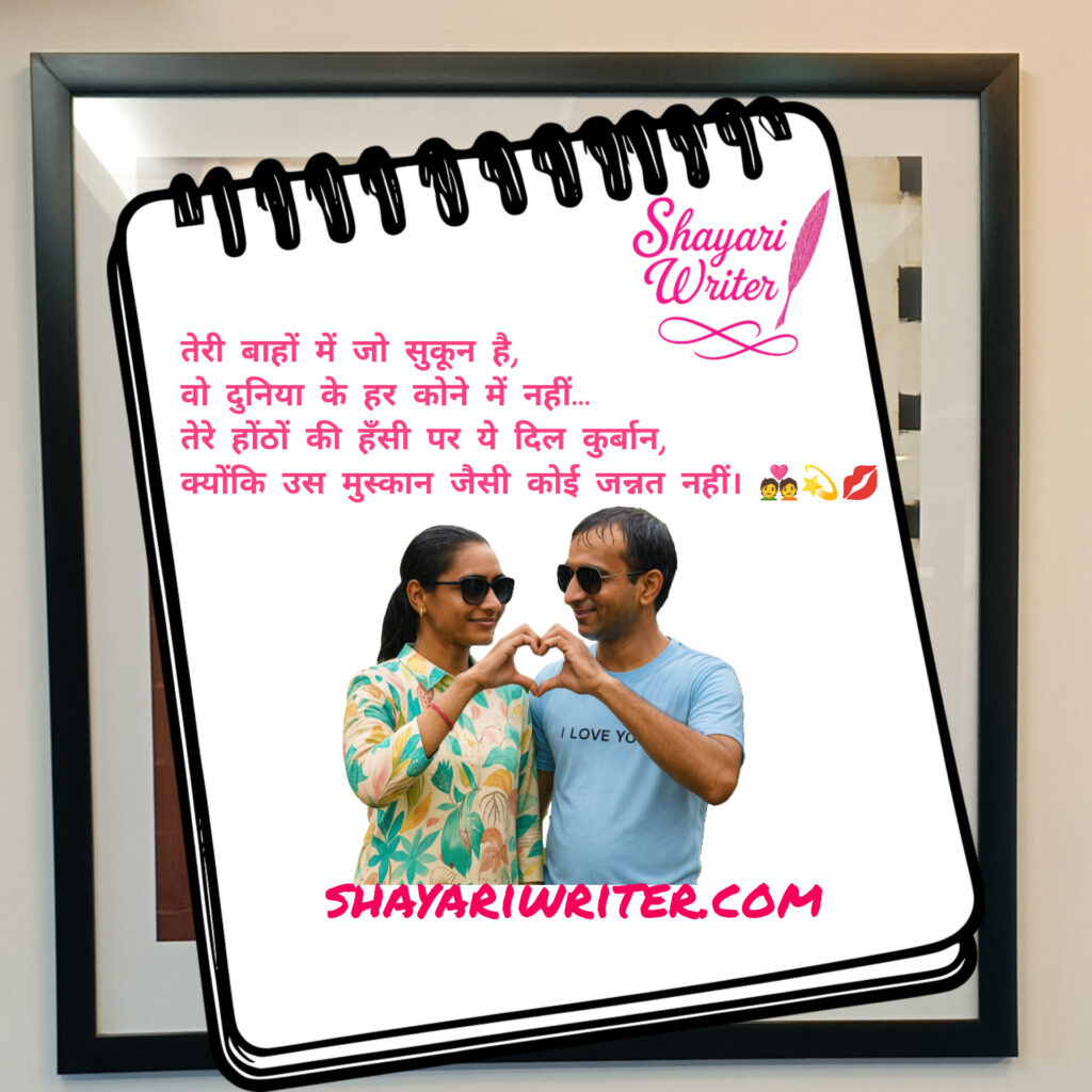 Love/Ishq Shayari तेरी बाहों में जो सुकून है,वो दुनिया के हर कोने में नहीं…तेरे होंठों की हँसी पर ये दिल कुर्बान,क्योंकि उस मुस्कान जैसी कोई जन्नत नहीं। 💑💫💋 admin July 29, 2025 Author admin Continue Reading Previous Previous post: तेरे बिना अधूरी है ज़िंदगी मेरी,तेरे साथ ही हर खुशी लगती है मेरी।तेरे इश्क़ में जो सुकून है जानम,वो न दुआ में है, न किसी जन्नत में। 💖🌹✨Next Next post: हर धड़कन में बसते हो तुम,हर सांस में महसूस होते हो तुम।तुमसे दूर होकर भी,हर पल मेरे सबसे करीब होते हो तुम। 💓🌙 Leave a Reply Cancel replyYour email address will not be published. Required fields are marked *Comment * Name * Email * Website Save my name, email, and website in this browser for the next time I comment. Related News कोहरे में लिपटी सुबह और चाय की वो तन्हा प्याली,रोज़ उसे भागते हुए देखना, मेरी आदत थी पुरानी। 👀🚲आज बिखर गए पन्ने, तो सिमट गईं दूरियाँ,कल से उस बेंच पर, होंगी दो चाय की प्यालियाँ। ☕️☕️💑 December 28, 2025 🌹 तू साथ है तो हर ग़म भी मीठा लगे,💞 तेरे बिना हर पल अधूरा लगे… October 7, 2025