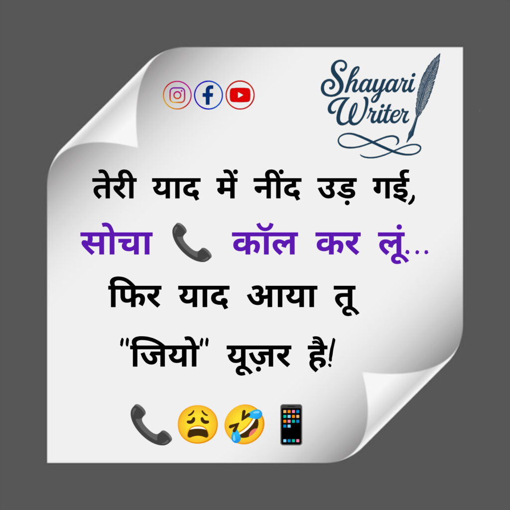Jokes तेरी याद में नींद उड़ गई,सोचा कॉल कर लूं…फिर याद आया तू “जियो” यूज़र है! admin May 22, 2025 Author admin Continue Reading Previous Previous post: तू जब-जब हँसती है,दिल में घंटियाँ बजती हैं,पर जब बोलती है,WiFi जैसी स्पीड घटती है!😄🔔📶😂Next Next post: तेरे इश्क़ में हम ऐसे जल गए,जैसे बिना बिजली के पंखे चल गए!🔥💔🪭😅 Leave a Reply Cancel replyYour email address will not be published. Required fields are marked *Comment * Name * Email * Website Save my name, email, and website in this browser for the next time I comment. Related News पप्पू 🤓: गर्लफ्रेंड बनाने के लिए क्या करना पड़ता है?गप्पू 😎: सिर्फ हिम्मत और Paytm 😬💸💔 July 24, 2025 पति 🤵: तुम हर बात में रो क्यों देती हो? 😩पत्नी 👰: क्योंकि आंसुओं से मेकअप अच्छा लगता है! 😜💄😂 July 24, 2025
