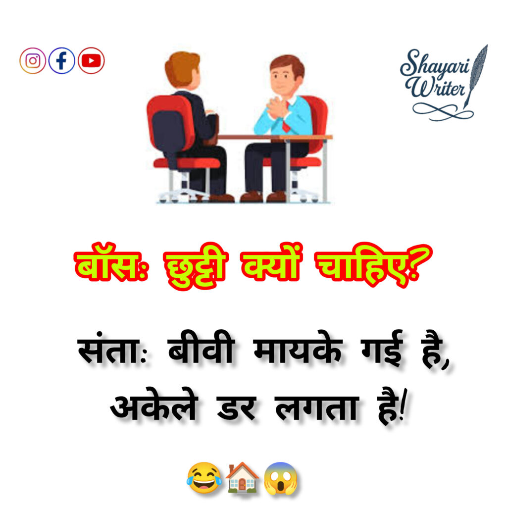 Jokes बॉस: छुट्टी क्यों चाहिए?संता: बीवी मायके गई है, अकेले डर लगता है!😂🏠😱 admin May 22, 2025 Author admin Continue Reading Previous Previous post: टीचर: बताओ नींद क्यों आती है?राजू: क्योंकि सपनों को भी तो टाइम पर आना होता है!😴🛌😂Next Next post: तू सोचे कि मैं तुझपे मरता हूँ,सच तो ये है मैं नींद से लड़ता हूँ!😴❤️😆 Leave a Reply Cancel replyYour email address will not be published. Required fields are marked *Comment * Name * Email * Website Save my name, email, and website in this browser for the next time I comment. Related News पप्पू 🤓: गर्लफ्रेंड बनाने के लिए क्या करना पड़ता है?गप्पू 😎: सिर्फ हिम्मत और Paytm 😬💸💔 July 24, 2025 पति 🤵: तुम हर बात में रो क्यों देती हो? 😩पत्नी 👰: क्योंकि आंसुओं से मेकअप अच्छा लगता है! 😜💄😂 July 24, 2025