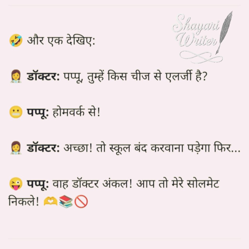 Jokes ЁЯСйтАНтЪХя╕П рдбреЙрдХреНрдЯрд░: рдкрдкреНрдкреВ, рддреБрдореНрд╣реЗрдВ рдХрд┐рд╕ рдЪреАрдЬ рд╕реЗ рдПрд▓рд░реНрдЬреА рд╣реИ? admin June 17, 2025 Author admin Continue Reading Previous Previous post: “рдЪрдордХрддреА рдзреВрдк рд╕реА рддреВ, рдкреАрд▓реА рд╕рд╛рдбрд╝реА рдореЗрдВ рдмрд╣рд╛рд░ рд▓рдЧрддреА рд╣реИ… тШАя╕ПЁЯТЫNext Next post: рд▓рд╛рд▓ рд╕рд╛рдбрд╝реА рдореЗрдВ рддреВ рдЬрдм рд╕рд╛рдордиреЗ рдЖрдИ,рджрд┐рд▓ рдХреА рдзрдбрд╝рдХрди рднреА рд╢рд░реНрдорд╛рдИ… ЁЯТУ Leave a Reply Cancel replyYour email address will not be published. Required fields are marked *Comment * Name * Email * Website Save my name, email, and website in this browser for the next time I comment. Related News рдкрдкреНрдкреВ ЁЯдУ: рдЧрд░реНрд▓рдлреНрд░реЗрдВрдб рдмрдирд╛рдиреЗ рдХреЗ рд▓рд┐рдП рдХреНрдпрд╛ рдХрд░рдирд╛ рдкрдбрд╝рддрд╛ рд╣реИ?рдЧрдкреНрдкреВ ЁЯШО: рд╕рд┐рд░реНрдл рд╣рд┐рдореНрдордд рдФрд░ Paytm ЁЯШмЁЯТ╕ЁЯТФ July 24, 2025 рдкрддрд┐ ЁЯд╡: рддреБрдо рд╣рд░ рдмрд╛рдд рдореЗрдВ рд░реЛ рдХреНрдпреЛрдВ рджреЗрддреА рд╣реЛ? ЁЯШйрдкрддреНрдиреА ЁЯС░: рдХреНрдпреЛрдВрдХрд┐ рдЖрдВрд╕реБрдУрдВ рд╕реЗ рдореЗрдХрдЕрдк рдЕрдЪреНрдЫрд╛ рд▓рдЧрддрд╛ рд╣реИ! ЁЯШЬЁЯТДЁЯШВ July 24, 2025