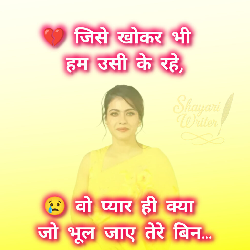 Shayari Writer 💔 जिसे खोकर भी हम उसी के रहे,😢 वो प्यार ही क्या जो भूल जाए तेरे बिन… admin November 5, 2025 Author admin Continue Reading Previous Previous post: 🌙 हर कोना तेरी यादों से भरा है,😢 दिल तन्हा है पर तेरा साया खड़ा है…Next Next post: 🌧️ हर कदम पर उम्मीद ने संभाला है,💔 वो लौट आएगा, यही ख्याल पाला है… Leave a Reply Cancel replyYour email address will not be published. Required fields are marked *Comment * Name * Email * Website Save my name, email, and website in this browser for the next time I comment. Related News 🖤 हमने खुद को खो दिया,💔 उन्होंने कुछ भी नहीं खोया। January 2, 2026 अकेलापन 😔 कोई शौक नहीं होता,ये तो लोगों के बदलने का नतीजा होता है 💔 December 23, 2025