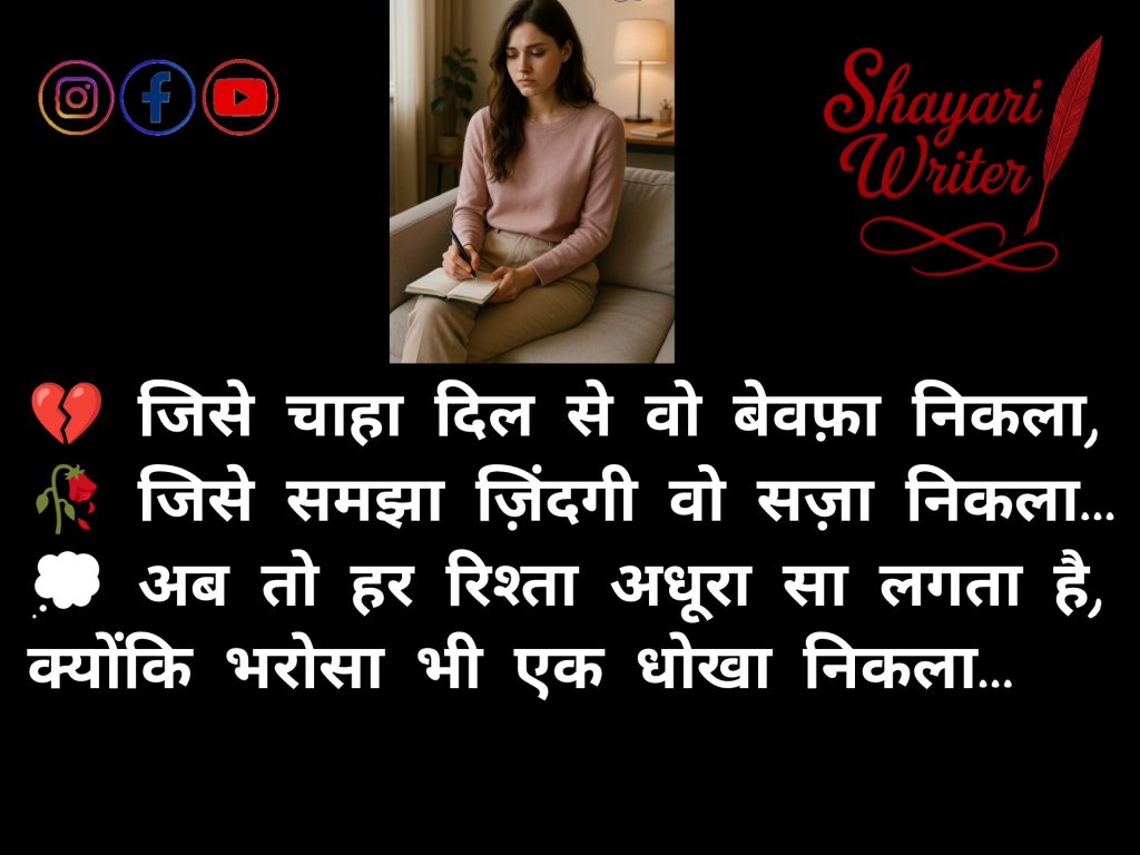 Bewafa shayari 💔 जिसे चाहा दिल से वो बेवफ़ा निकला, admin June 5, 2025 Author admin Continue Reading Previous Previous post: 🌙 हर रात उसकी याद में बीत जाती है,Next Next post: 💘 हमने जिसको अपनी जान बना लिया, Leave a Reply Cancel replyYour email address will not be published. Required fields are marked *Comment * Name * Email * Website Save my name, email, and website in this browser for the next time I comment. Related News हमने सच माना जिसे हर पल 🥀वही निकला सबसे बड़ा झूठ 💔 December 17, 2025 जिस दिल ने टूटना नहीं सीखा था 😔उसी दिल ने मोहब्बत में धोखा खाया 💔 December 16, 2025
