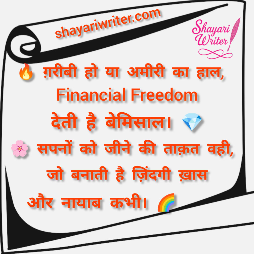 Financial freedom 🔥 ग़रीबी हो या अमीरी का हाल,Financial Freedom देती है बेमिसाल। 💎🌸 सपनों को जीने की ताक़त वही,जो बनाती है ज़िंदगी ख़ास और नायाब कभी। 🌈 admin September 18, 2025 Author admin Continue Reading Previous Previous post: 🌍 दौलत से बढ़कर है समय का मोल,Financial Freedom है सबसे बड़ा गोल। 🎯📖 सीखो पैसों का असली इस्तेमाल,तभी होगा ज़िंदगी में कमाल। ✨Next Next post: 💡 कमाई बहुत है पर सुकून नहीं,Financial Freedom के बिना जुनून नहीं। 🔥📈 पैसों को अपनाओ समझदारी से,तभी खुलेगी राह जिम्मेदारी से। 🛤️ Leave a Reply Cancel replyYour email address will not be published. Required fields are marked *Comment * Name * Email * Website Save my name, email, and website in this browser for the next time I comment. Related News 🌹 आज़ादी का स्वाद वही जानता है,जो पैसों की बेड़ियाँ तोड़ पाता है। 🗝️💰 Financial Freedom ही असली जीत है,जो इंसान को खुद से मिलाता है। 🌟 September 23, 2025 💡 कमाई बहुत है पर सुकून नहीं,Financial Freedom के बिना जुनून नहीं। 🔥📈 पैसों को अपनाओ समझदारी से,तभी खुलेगी राह जिम्मेदारी से। 🛤️ September 21, 2025