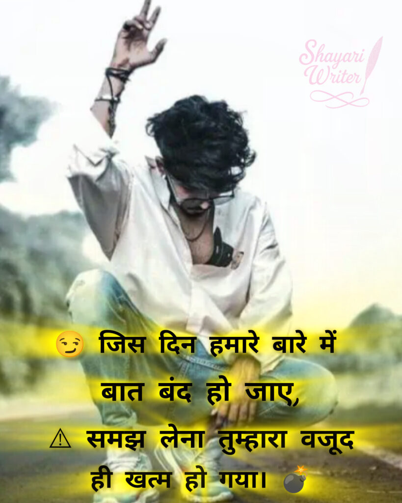 Attitude shayari ЁЯШП рдЬрд┐рд╕ рджрд┐рди рд╣рдорд╛рд░реЗ рдмрд╛рд░реЗ рдореЗрдВ рдмрд╛рдд рдмрдВрдж рд╣реЛ рдЬрд╛рдП,тЪая╕П рд╕рдордЭ рд▓реЗрдирд╛ рддреБрдореНрд╣рд╛рд░рд╛ рд╡рдЬреВрдж рд╣реА рдЦрддреНрдо рд╣реЛ рдЧрдпрд╛редЁЯТг admin July 14, 2025 Author admin Continue Reading Previous Previous post: ЁЯжБ рд╢реЗрд░ рдЕрдкрдирд╛ рдбрд░ рдирд╣реАрдВ рджрд┐рдЦрд╛рддрд╛,ЁЯТк рдФрд░ рд╣рдо рдЕрдкрдирд╛ Attitude рдирд╣реАрдВ рдмрджрд▓рддреЗ!ЁЯШдNext Next post: ЁЯЪл рдШрдордВрдб рдирд╣реАрдВ рд╣реИ рд╕рд╛рд╣рдм, рдкрд░ рдЦреБрдж рдкрд░ рднрд░реЛрд╕рд╛ рдмрд╣реБрдд рд╣реИ,ЁЯСК рдЗрд╕рд▓рд┐рдП рд╕рдмрдХреЛ рдЬрд╡рд╛рдм рджреЗрдирд╛ рдЬрд╝рд░реВрд░реА рдирд╣реАрдВ рд╕рдордЭрддреЗредЁЯШМ Leave a Reply Cancel replyYour email address will not be published. Required fields are marked *Comment * Name * Email * Website Save my name, email, and website in this browser for the next time I comment. Related News рдФрдХрд╝рд╛рдд рдХреА рдмрд╛рдд рдордд рдХрд░ рдкрдЧрд▓реА,рд╣рдо рддреЛ рд╡реЛ рд╣реИрдВ рдЬреЛ рдЖрдЗрдирд╛ рднреА рджреЗрдЦрдХрд░ рд╢рд░реНрдорд╛ рдЬрд╛рдПредЁЯШОЁЯе│ July 18, 2025 ЁЯСС рд╣рдорд╕реЗ рдореБрдХрд╛рдмрд▓рд╛ рдХрд░рдирд╛ рдЖрд╕рд╛рди рдирд╣реАрдВ,ЁЯЫС рдХреНрдпреЛрдВрдХрд┐ рд╣рдо рд╡рд╣рд╛рдБ рдЦрдбрд╝реЗ рд╣реЛрддреЗ рд╣реИрдВ рдЬрд╣рд╛рдБ рд▓реЛрдЧ рдЦрдбрд╝реЗ рд╣реЛрдиреЗ рд╕реЗ рдбрд░рддреЗ рд╣реИрдВредЁЯТе July 14, 2025