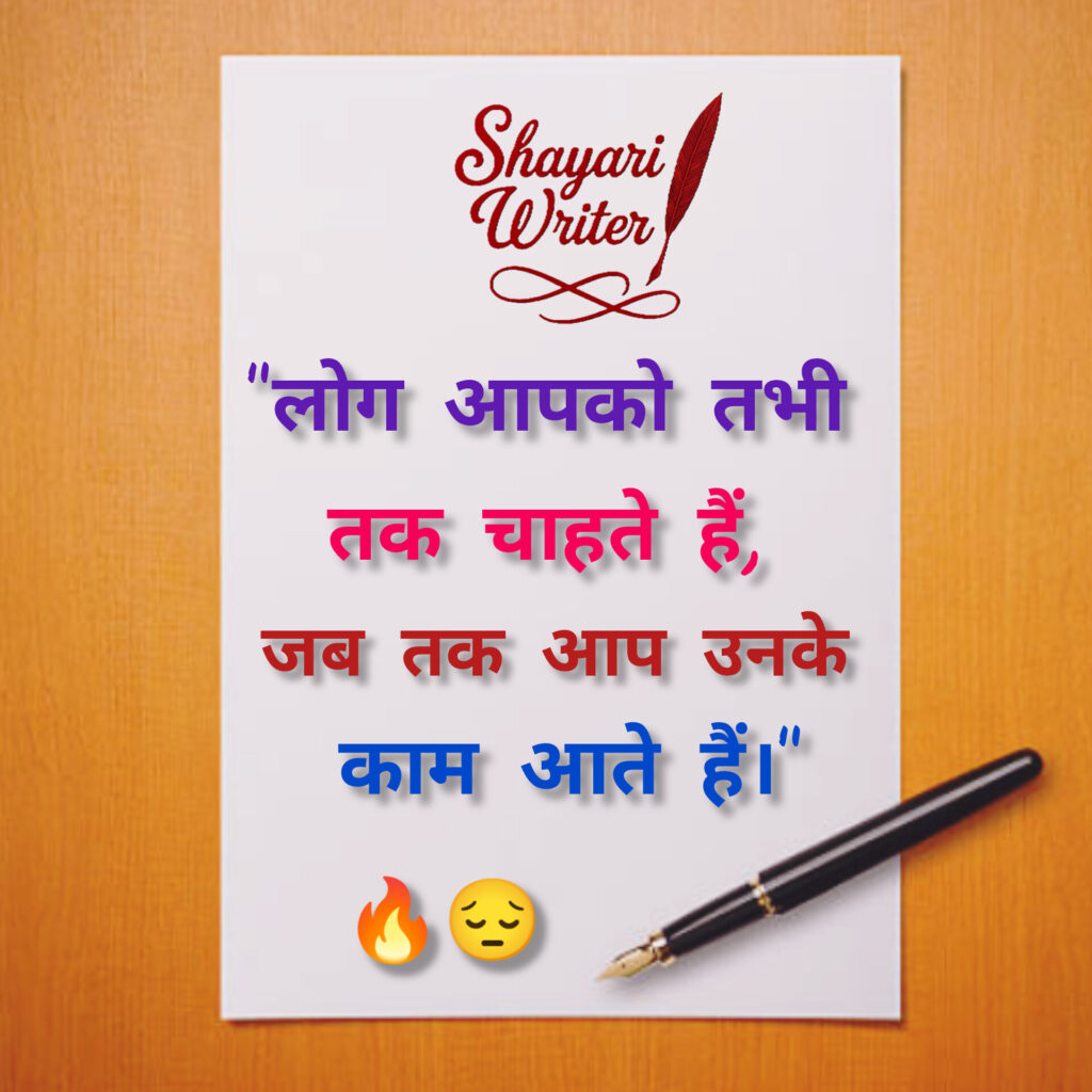 Sad shayari 😒🔥”लोग आपको तभी तक चाहते हैं,जब तक आप उनके काम आते हैं।” admin September 7, 2025 Author admin Continue Reading Previous Previous post: 😢🥀”अकेले रहना आसान है,क्योंकि लोग सिर्फ तकलीफ़ देते हैं।”Next Next post: 💔🕰️”वक़्त के साथ सब बदल जाते हैं,सिवाय उस दर्द के जो अपनों ने दिया होता है।” Leave a Reply Cancel replyYour email address will not be published. Required fields are marked *Comment * Name * Email * Website Save my name, email, and website in this browser for the next time I comment. Related News 💧 अब मोहब्बत से भी डर लगता है,💔 टूटे दिल का दर्द फिर जलता है… November 10, 2025 🌙 वो बिछड़ा तो वक़्त थम सा गया,💧 पर यादों का सिलसिला चलता गया… November 6, 2025
