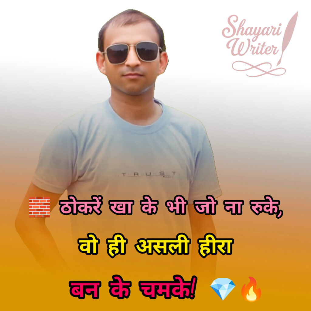 Motivational Shayari 🧱 ठोकरें खा के भी जो ना रुके,वो ही असली हीरा बन के चमके! 💎🔥 admin August 7, 2025 Author admin Continue Reading Previous Previous post: 💣 जिस दिन खुद पर भरोसा कर लिया,उस दिन तू भी ज़िंदगी से जीत जाएगा! 🏆💪Next Next post: 💪 हालात चाहे जैसे भी हों, मत डर,संघर्ष ही तो करता है पत्थर को नगीना! ✨🗿 Leave a Reply Cancel replyYour email address will not be published. Required fields are marked *Comment * Name * Email * Website Save my name, email, and website in this browser for the next time I comment. Related News 🚀 सपनों का आसमान उन्हीं को मिलता है,जो संघर्ष को अपना ईंधन बना लेते हैं! ⛽✨ August 12, 2025 🕯️ अंधेरों से मत डर, रोशनी खुद बन,संघर्ष को अपनाकर ही महान बन! 🌟🔥 August 12, 2025