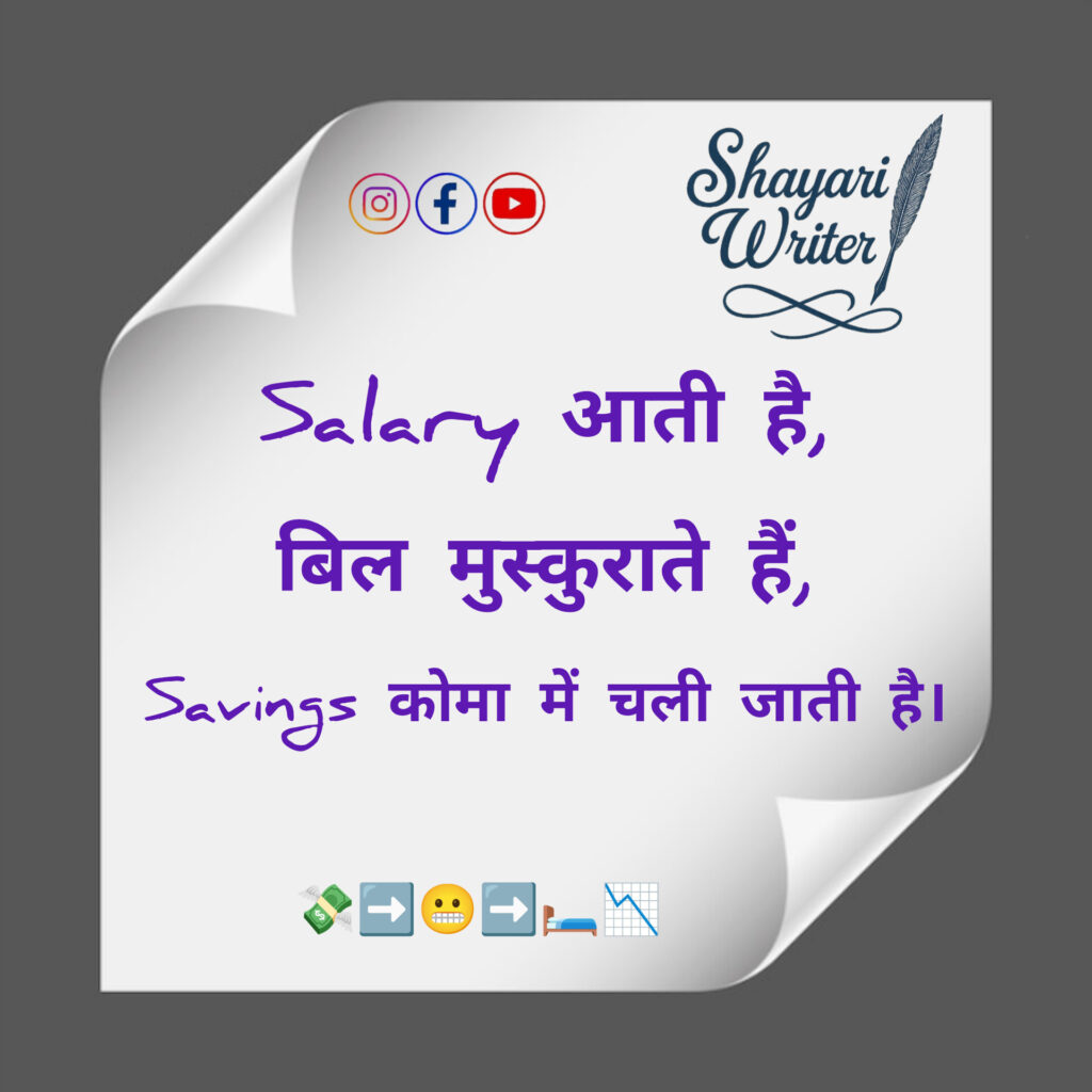 Jokes Salary आती है,बिल मुस्कुराते हैं,Savings कोमा में चली जाती है।💸➡️😬➡️🛏️📉 admin May 24, 2025 Author admin Continue Reading Previous Previous post: सैलरी में इतनी ताक़त नहीं,कि महीने भर जिएं…बस 10 दिन रॉयल,बाकी संघर्ष।👑➡️📉➡️🫠Next Next post: तेरा साथ छूटा 💔सपनों का रंग रूठा 🌙अब हर मुस्कान के पीछे है एक दर्द 😢 Leave a Reply Cancel replyYour email address will not be published. Required fields are marked *Comment * Name * Email * Website Save my name, email, and website in this browser for the next time I comment. Related News पप्पू 🤓: गर्लफ्रेंड बनाने के लिए क्या करना पड़ता है?गप्पू 😎: सिर्फ हिम्मत और Paytm 😬💸💔 July 24, 2025 पति 🤵: तुम हर बात में रो क्यों देती हो? 😩पत्नी 👰: क्योंकि आंसुओं से मेकअप अच्छा लगता है! 😜💄😂 July 24, 2025